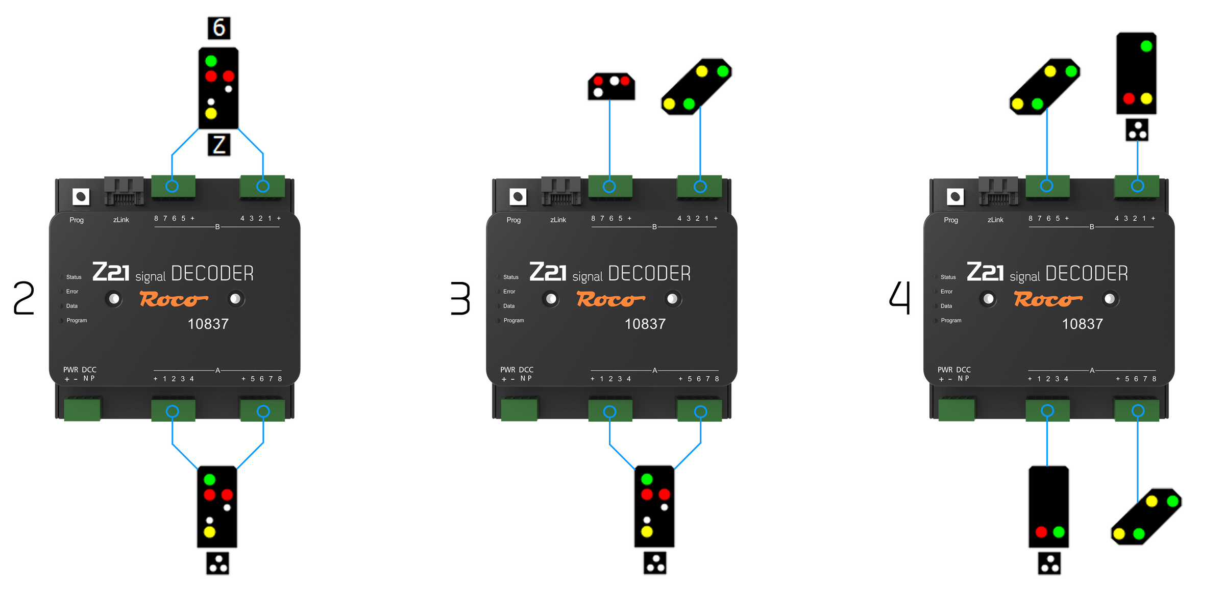 Dazu sind die Ausgänge auch vor Überlast und Kurzschluss gesichert. Die Signale werden mit einem gemeinsamen Plus angeschlossen. Jedes LED wird mit einem eigenen Vorwiderstand am Z21 signal DECODER angeschlossen, weil die Ausgangsspannung der Versorgungsspannung entspricht.